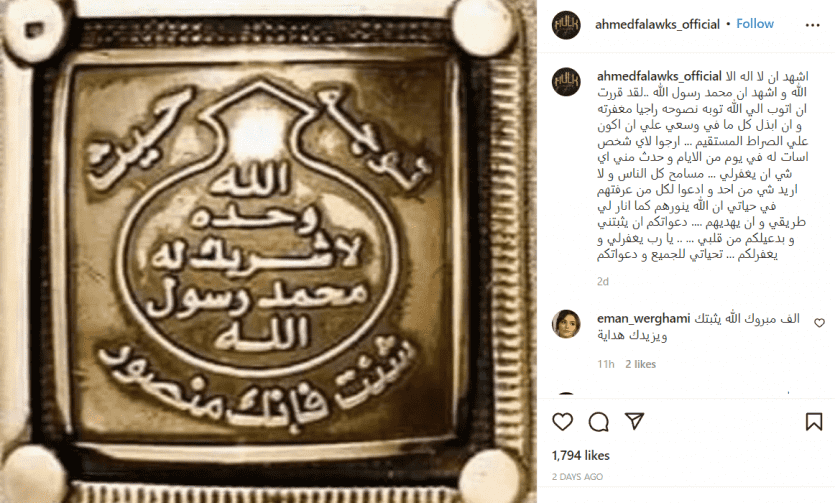 وقال الفنان أحمد فلوكس عبر حسابه بـ"إنستغرام"، "لقد قررت أن أتوب إلى الله توبة نصوحة راجيا مغفرته وأن أبذل كل ما في وسعي على أن أكون على الصراط المستقيم".