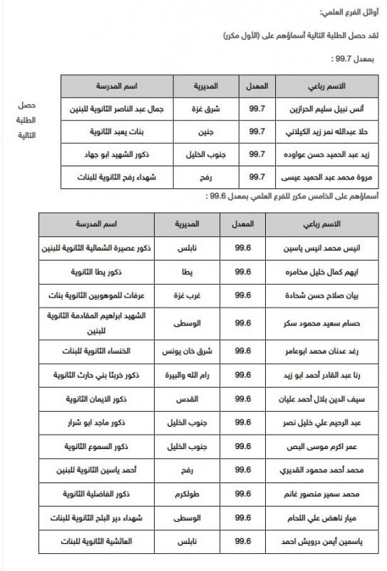 أسماء العشرة الأوائل في الثانوية العامة 2022 فلسطين