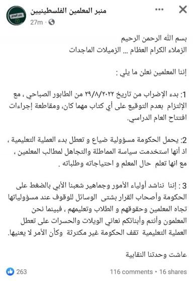 أعلن منبر المعلمين الفلسطينيين اليوم الأربعاء، عن بدء الإضراب من جديد بتاريخ 29/8/2022، أي مع بداية العام الدراسي الجديد.