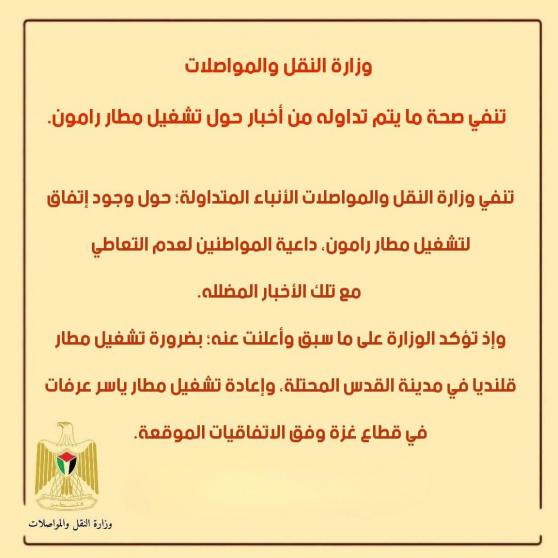 النقل والمواصلات تنفي ما يتم تداوله من أخبار حول تشغيل مطار رامون