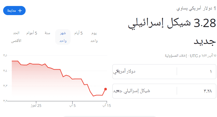 يشهد سعر صرف الدولار الآن مقابل الشيكل الاسرائيلي، مساء اليوم الاثنين، 15 أغسطس 2022، ارتفاعا في التداولات المصرفية، عما كان عليه في ساعات الصباح الأولى.