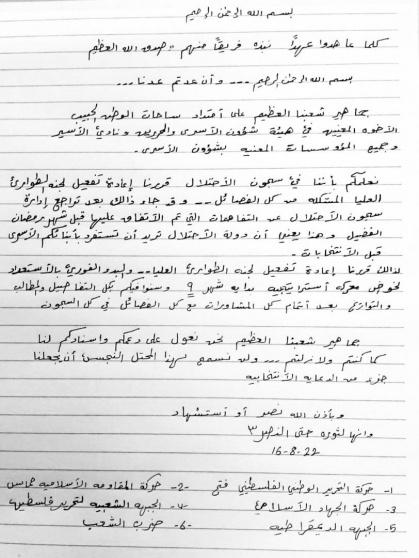 ودعا الأسرى أبناء شعبهم إلى مساندتهم وإسنادهم في خطواتهم القادمة.