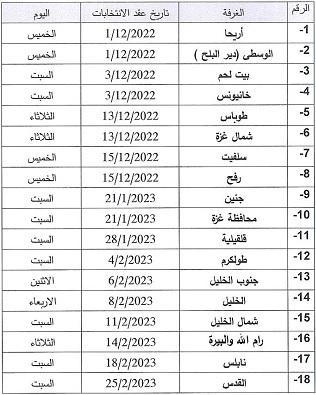 وستبدأ الانتخابات في محافظتي أريحا ودير البلح يوم الخميس الموافق الأول من كانون الأول/ديسمبر، على أن تجري الانتخابات في جميع المحافظات وفق الجدول التالي: