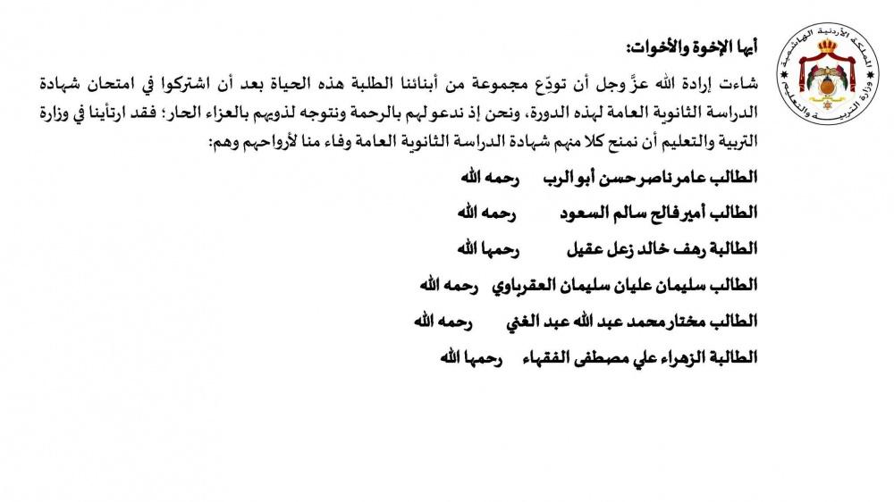 أسماء أوائل الثانوية العامة التوجيهي 2022 في الأردن