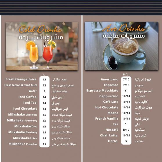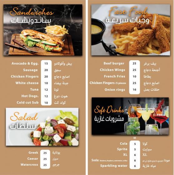ومن الخدمات التي يخدمها المقهى للزبائن "جميع أنواع المشروبات الساخنة والباردة، والأراجيل، وسندويتشات ووجبات خفيفة منوعة، بالإضافة إلى أنواع متعددة من الحلويات".