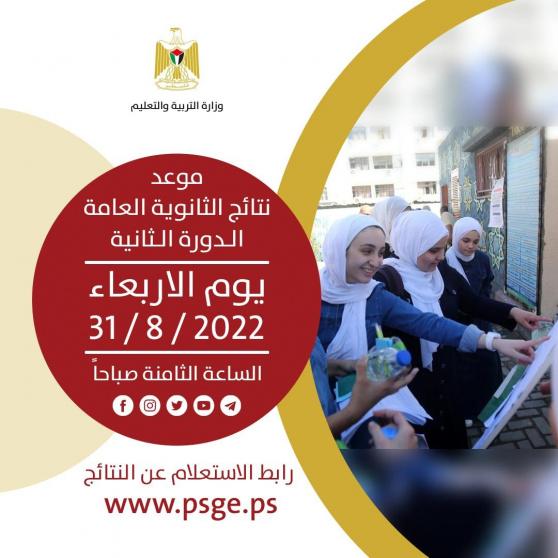 قررت لجنة الامتحانات العامة في وزارة التربية والتعليم عقب اجتماعها، اليوم، أن موعد إعلان نتائج الثانوية العامة للعام 2022 (الدورة الثانية) سيكون يوم غدٍ الأربعاء في تمام الساعة الثامنة صباحاً عبر الموقع التالي ( اضغط هنا ) .
