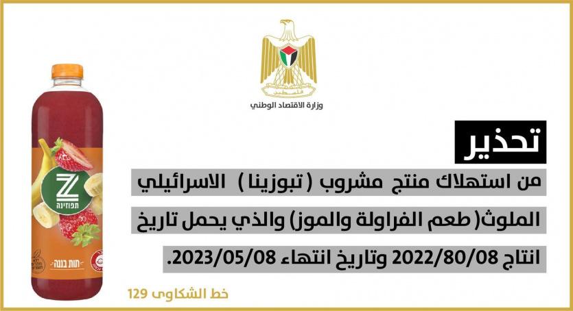حذرت وزارة الاقتصاد الوطني، اليوم الأربعاء، المواطنين من استهلاك منتج مشروب "تبوزينا" الإسرائيلي الملوث "طعم الفراولة والموز"، والذي يحمل تاريخ انتاج 08/80/2022 وتاريخ انتهاء 08/05/2023.