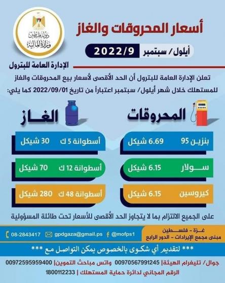 ويبلغ سعر ليتر البنزين 95 أوكتان في قطاع غزة هذا الشهر 6.69 شيكل والسولار 6.15 شيكل وسعر أسطوانة الغاز 12ك تباع بـ 70 شيكل "بدون توصيل للبيت".