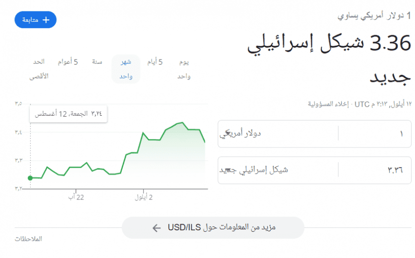 شهد سعر صرف الدولار الأمريكي انخفاضا كبيرا أمام الشيكل الإسرائيلي، مساء اليوم الإثنين 12 أيلول - سبتمبر 2022، ما يشير إلى عودة قوية للعملة الإسرائيلية.
