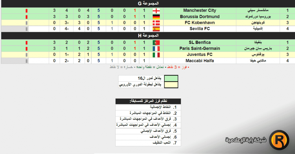 أما المجموعة الثانية فيحتل فريق اتلتيكو مدريد الاسباني صدارتها برصيد 3 نقاط بالتساوي مع كلوب بروج البليجيكي، في حين يحتل بورتو البرتغالي المركز الثالث بدون أي نقاط كما هو الحال مع فريق نادي بايرن ليفركوزن الألماني.
