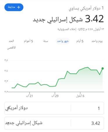 ويذكر أن الدولار الأمريكي صُرف مقابل الشيكل الإسررائيلي صباح اليوم بسعر 3.36.