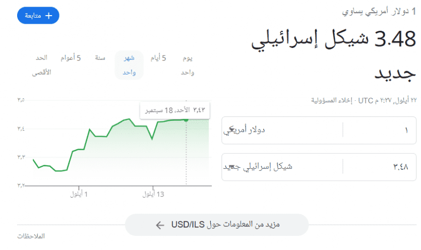 والجدير بالذكر أن سعر صرف الدولار الأمريكي مقابل الشيكل الإسرائيلي قد يرتفع أو ينخفض خلال ساعات نهار اليوم وذلك وفقا للتداولات المصرفية العالمية.