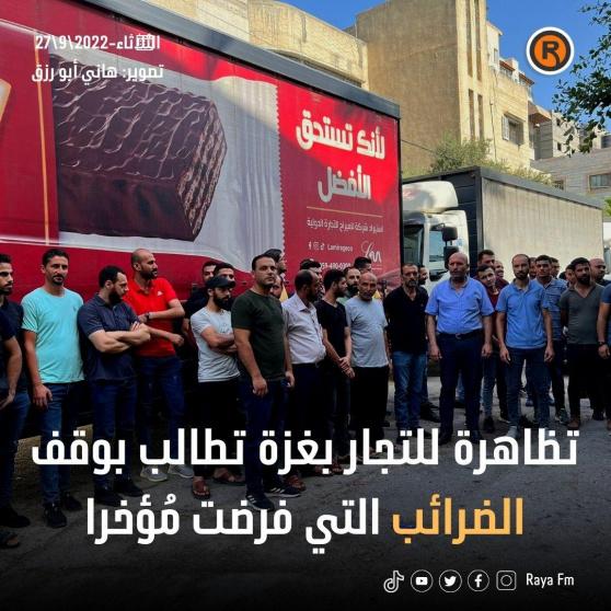 نظم المئات من التجار من ضمنهم أصحاب عشرات الشاحنات اليوم الثلاثاء، في تظاهرة أمام مقر الغرفة التجارية بمدينة غزة للمطالبة بوقف الضرائب التي فرضتها وزارة الاقتصاد بغزة مؤخرا.