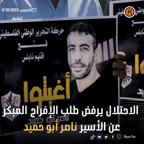 وأفاد المتحدث باسم هيئة شؤون الأسرى والمحررين حسن عبد ربه، بأن اللجنة الخاصة بالنظر في طلب الإفراج المبكر عن الأسير ناصر أبو حميد، المصاب بالسرطان، والذي يعاني تدهورا كبيرا في وضعه الصحي، عقدت بطلب قدمه محاميه استنادا إلى التقرير الطبي النهائي الذي صدر عن مستشفى "أساف هروفيه" الإسرائيلي، والذي أوصى فيه الأطباء بالإفراج عنه في أيامه الأخيرة.