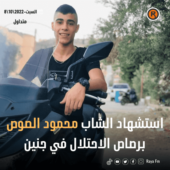 كما أعلن مصدر طبي في مستشفى ابن سينا، عن استشهاد الفتى محمود مؤيد الصوص، متأثرا بجروح حرجة أصيب بها في منطقة الرقبة.