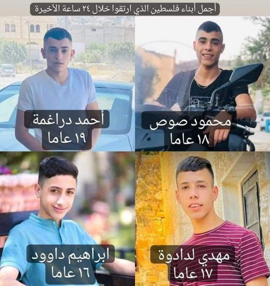 وبعد الاعلان عن استشهاد الفتيين، ترتفع حصيلة الشهداء خلال الـ24 ساعة إلى 4 شهداء، بعد ارتقاء الطفل عادل إبراهيم عادل داود (14 عاما)، يوم أمس، متأثرا بإصابته بالرصاص الحي في الرأس، قرب جدار الضم والفصل العنصري، جنوب قلقيلية، والفتى مهدي لدادوة (17 عاما) خلال مواجهات اندلعت في قرية المزرعة الغربية، شمال غرب رام الله.