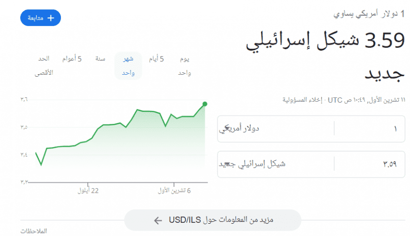 بحسب المعلومات الرسمية المتوفرة، أصبح الدولار الأمريكي يصرف كما يظهر على الشاشة بـ 3.59 شيكل إسرائيلي، في ارتفاع جديد عن ساعات الصباح.