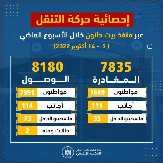 إحصائية حركة التنقل عبر منفذ بيت حانون خلال الأسبوع الماضي (9-14 أكتوبر 2022)