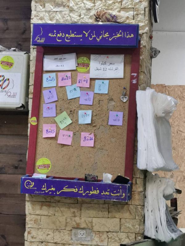 ضمن مبادرة "الخبز مجاني لمن لا يستطيع دفع ثمنه"، بالتعاون بين مؤسسة سوا ومخبزجوهرة القدس، بدعم من المواطنين تم توزيع ما يزيد عن ربع مليون رغيف خبز منذ انشاء لوحة وانت تعد فطورك فكر بغيرك.