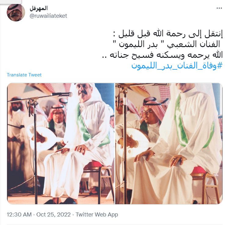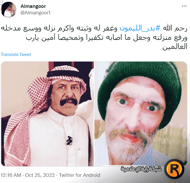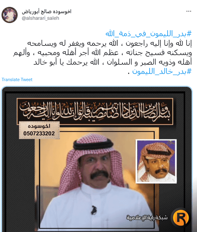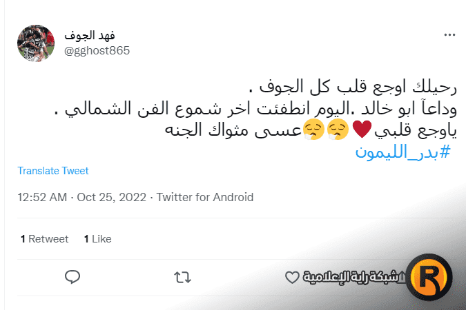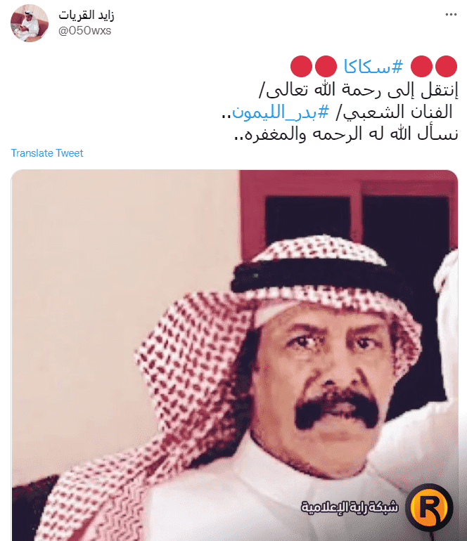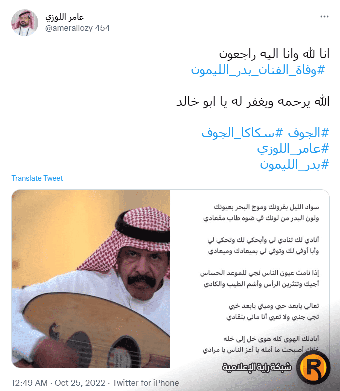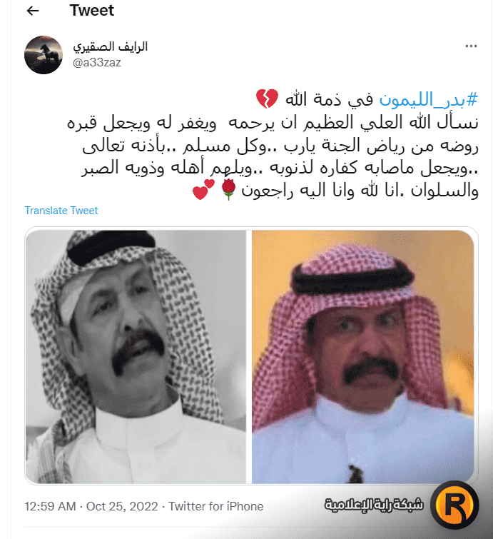 أعلنت مصادر إعلامية سعودية، اليوم الثلاثاء 25 أكتوبر/تشرين أول 2022، عن وفاة بدر الليمون الفنان الشعبي السعودي الشهير والذي اشتهر في الفن الشمالي؛ وذلك بعد معاناة خلال الفترة الماضية في المستشفيات.