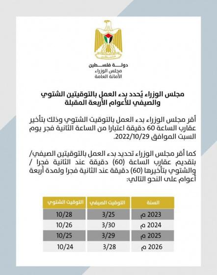 كما أقر مجلس الوزراء تحديد بدء العمل بالتوقيتين الصيفي/ بتقديم عقارب الساعة (60) دقيقة عند الثانية فجرا، والشتوي بتأخيرها (60) دقيقة عند الثانية فجرا ولمدة أربعة أعوام وفق الجدول المرفق.