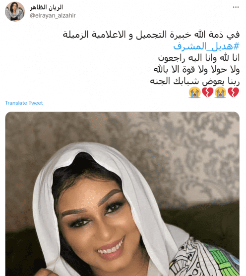 وكتبت الإعلامية الريان الظاهر في تغريده عبر حسابها في تويتر: "هديل المشرف في ذمة الله، ربنا يعوضك شبابك الجنة. إنا لله وإنا إليه راجعون ولا حول ولا قوة إلا بالله"، مشيرة إلى أنها زميلة إعلامية وخبيرة في التجميل.