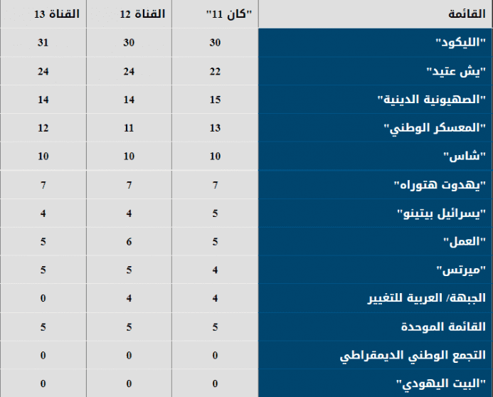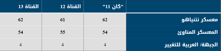 في حين تراوحت قوة الأحزاب العربية بين 8 - 9 مقاعد، ولم يتمكن حزب التجمع الوطني الديمقراطي، حتى هذه اللحظة، من تجاوز نسبة الحسم، حسب عينات القنوات الإسرائيلية. وبينت نتائج العينات الانتخابية، هيمنة الأحزاب اليمينية على الكنيست المقبل وحصولها على قوة تتراوح بين 67-65 مقعدا من أصل 120.