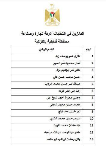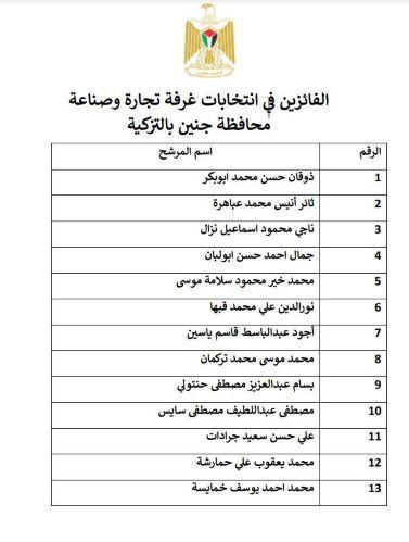 إعلان أسماء الفائزين بالتزكية بعضوية غرفتي تجارة وصناعة جنين وقلقيلية