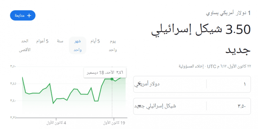 شهد سعر صرف الدولار مقابل الشيكل الاسرائيلي مساء اليوم الخميس 22 ديسمبر 2022، ارتفاعا جديدا وكبيرا بشكل مفاجئ في التداولات المصرفية المسائية، مسجلا قفزة جديدة عما كان عليه في ساعات الصباح الأولى.