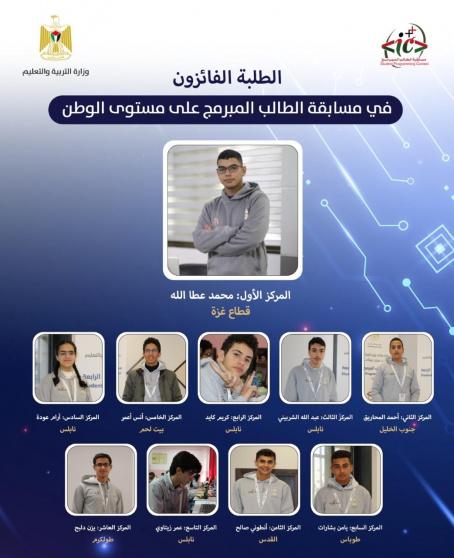أعلنت وزارة التربية والتعليم، بالتعاون مع جامعة فلسطين التقنية "خضوري"، والكلية الجامعية في قطاع غزة، نتائج مسابقة الطالب المبرمج بنسختها الرابعة، والتي أقيمت في المركز التربوي التابع للوزارة والمدرسة التركية للبنات في محافظة رام الله والبيرة، وفي مبنى الكلية الجامعية بغزة.