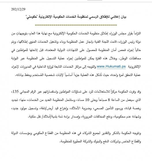 التزاما بقرار مجلس الوزراء إطلاق منظومة الخدمات الحكومية الإلكترونية مع نهاية هذا العام، بتوجيهات من رئيس الوزراء محمد اشتية، أنجزت اللجنة الفنية عمل المنظومة وبناء وتشغيل الخدمات المنوي إطلاقها.