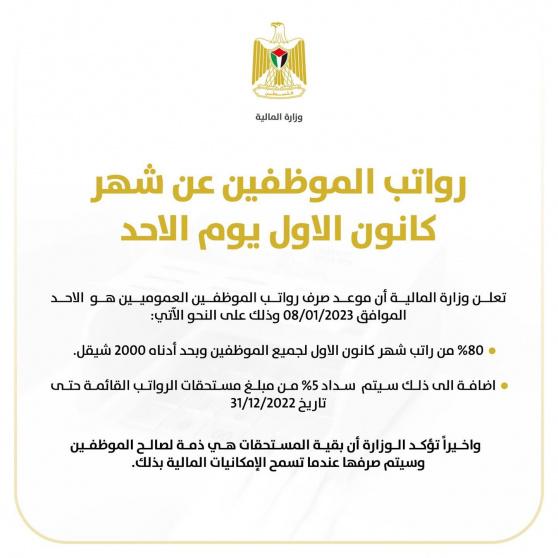 أعلنت وزارة المالية، اليوم الخميس، أن موعد صرف رواتب الموظفين العموميين عن شهر كانون الأول الماضي هو الاحد المقبل 8/1/2023.