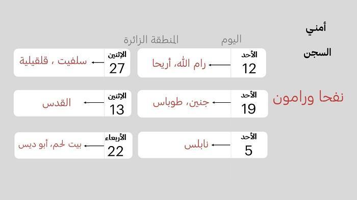 وأوضحت اللجنة، في بيان لها، أنه تم تغيير تاريخ بعض الزيارات لبعض السجون خلال شهر شباط المقبل، وأنه يجب التسجيل في التاريخ المحدد للزيارة قبل انتهاء موعد التسجيل (أسبوع قبل تاريخ الزيارة)، آملة الاستئناف الكامل لبرنامج الزيارات العائلية.
