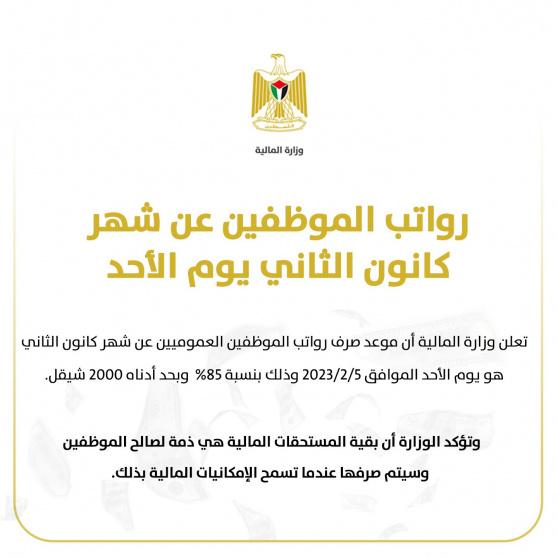 أعلنت وزارة المالية الفلسطينية عن نسبة وموعد صرف رواتب الموظفين عن شهر كانون الثاني.