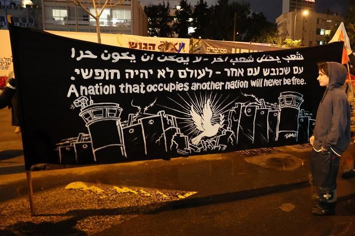 ورفع المشاركون يافطات كتب عليها شعارات بالعبرية والإنجليزية والعربية، من ضمنها: "حياة الفلسطينيين مهمة"، "شعب يحتل شعب آخر لا يمكن أن يكون حرا"، "نتنياهو، سموتريتش، بن غفير، تهديد للسلام في العالم"، و"ياريف ليفين عدو للديمقراطية"، و"حان وقت إسقاط الديكتاتور" و"حكومة العار"، و"بيبي (نتنياهو) فاقد للأهلية"، و"الابارتهاد لا يتوقف عند الخط الأخضر".