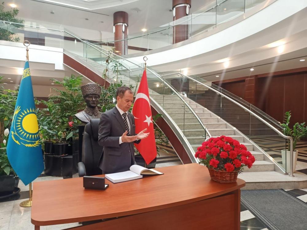 أدى السفير الفلسطيني لدى كازاخستان، عميد السلك الدبلوماسي العام، د. منتصر أبو زيد واجب العزاء في السفارة التركية بضحايا الزلزال في تركيا.