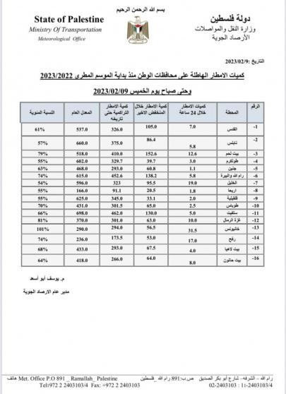 أصدرت دائرة الارصاد الجوية نشرة توضح فيها كميات الأمطار التي هطلت على محافظات فلسطين منذ بداية الموسم المطري 2022/2023. وحتى صباح اليوم الخميس.