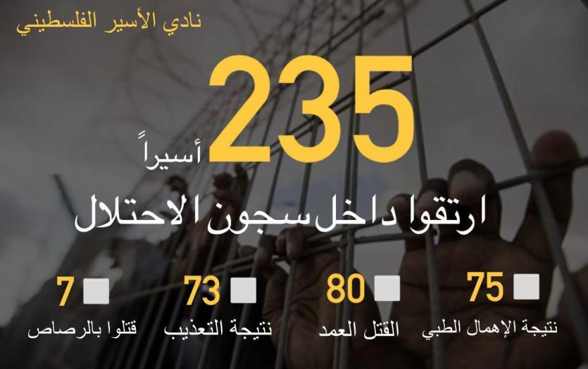 وعلى مدار السنوات القليلة الماضية فإن غالبية من ارتقوا شهداء في السّجون ارتقوا نتيجة لجريمة الإهمال الطبي (القتل البطيء)، وكذلك نتيجة للتعذيب، إلا أنّ جريمة الإهمال الطبيّ شكّلت السبب المركزي، فمن بين 235 شهيدا ارتقوا منذ عام 1967، هناك (75) أسيرًا ارتقوا نتيجة لجريمة الإهمال الطبيّ.