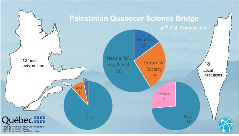 منحت أكاديمية فلسطين للعلوم والتكنولوجيا وصندوق الابحاث الكيبيكي، 34 باحثا فلسطينيا من الضفة الغربية وقطاع غزة والقدس مهمة علمية لمشاريع بحثية في ثلاثة مجالات واسعة، بما في ذلك العلوم الطبية والصحية، العلوم الطبيعية والهندسة والتكنولوجيا، والعلوم الاجتماعية، والعلوم الإنسانية، والفنون، وذلك بعد اجراء المقابلات من اللجنة التقييمية المشكلة من اللجنة الاستشارية ونخبة من دكاترة الجامعات الفلسطينية.