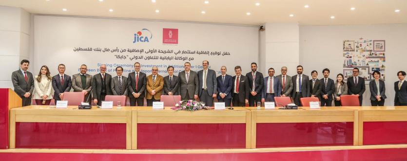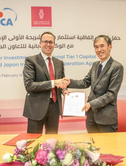 أعلنت مجموعة بنك فلسطين، اليوم، عن توقيع اتفاقية مع الوكالة اليابانية للتعاون الدولي (جايكا JICA) لاستثمار مبلغ 30 مليون دولار أمريكي، في الشريحة الاولى الإضافية من قاعدة رأس مال بنك فلسطين، حيث يُعدُ هذا الاستثمار الأول من نوعه الذي تنفذه "جايكا" على مستوى فلسطين والعالم، وذلك بعد الحصول على موافقة سلطة النقد الفلسطينية.