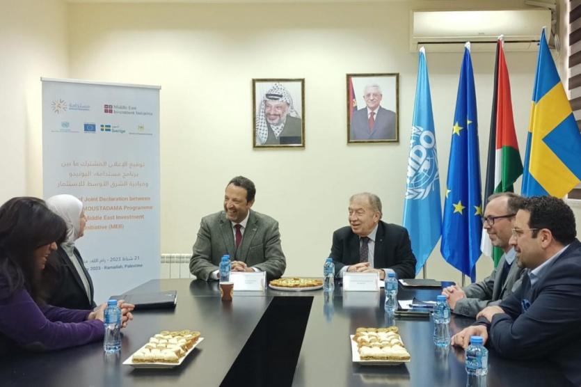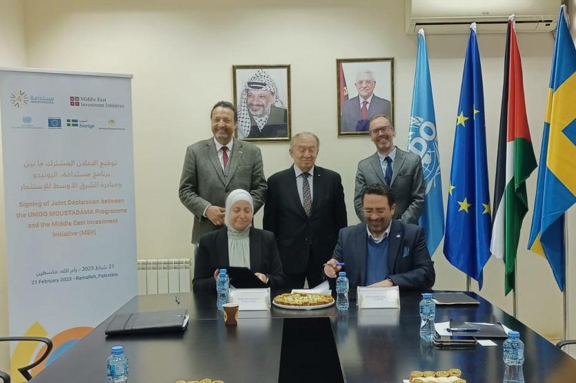 تحت رعاية وزير الاقتصاد الوطني خالد عسيلي، وقّع برنامج "مستدامة" التابع لمنظمة الأمم المتحدة للتنمية الصناعية (اليونيدو) ومبادرة الشرق الأوسط للاستثمار(MEII) ، اليوم الثلاثاء، إعلانا مشتركا لتسهيل وصول المنشآت الصناعية الفلسطينية الصغيرة والمتوسطة إلى التمويل.