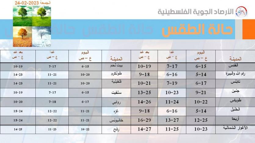 الجمعة: يكون الجو غائما جزئيا الى صاف ويطرأ ارتفاع على درجات الحرارة لتصبح حول معدلها السنوي العام ويحتمل سقوط امطار محلية خفيفة على بعض المناطق، والرياح شمالية غربية الى شمالية شرقية خفيفة الى معتدلة السرعة والبحر خفيف ارتفاع الموج.