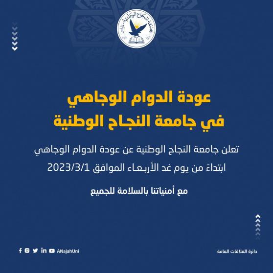 أعلنت جامعة النجاح الوطنية في نابلس، عن عودة الدوام الوجاهي في الجامعة اعتبارا من يوم غد الأربعاء الموافق 1 / 03 / 2023.