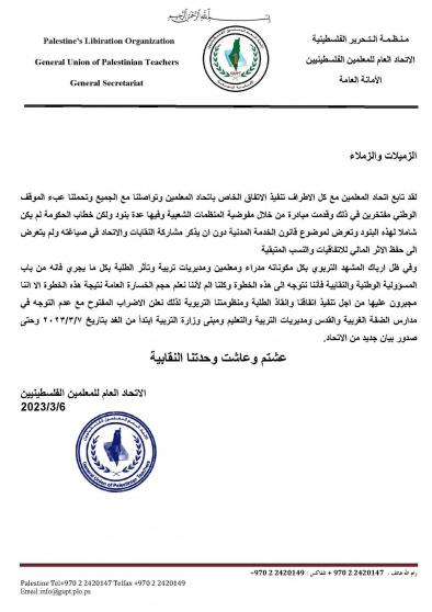 أعلن الاتحاد العام للمعلمين الفلسطينيين، في بيان صدر عنه اليوم الإثنين، الإضراب المفتوح مع عدم التوجه في مدارس الضفة الغربية والقدس ومديريات التربية والتعليم ومبنى وزارة التربية ابتداءً من يوم غد الثلاثاء 7 آذار 2023 وحتى صدور بيان جديد من الاتحاد.