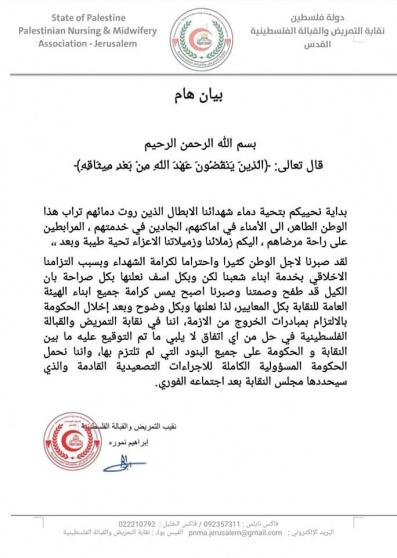 أعلنت نقابة التمريض والقبالة الفلسطينية أنه وبعد إخلال الحكومة بالالتزام بمبادرات الخروج من الأزمة، إنها في حل من أي اتفاق لا يلبي ما تم التوقيع عليه ما بين النقابة والحكومة على جميع البنود التي لم تلتزم بها.