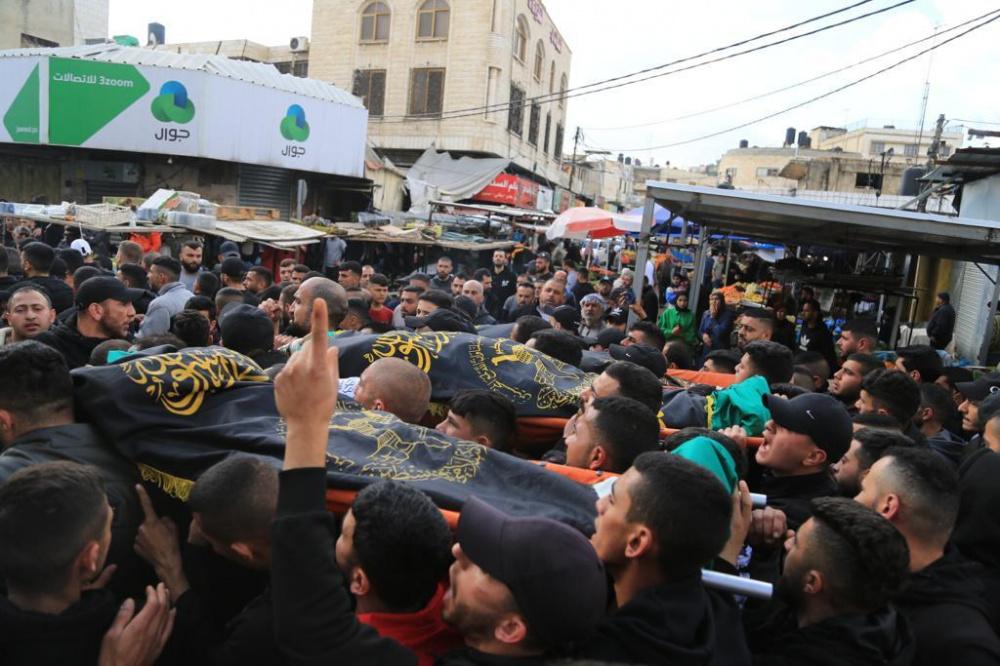 شيّعت جماهير غفيرة من أبناء شعبنا في محافظة جنين، اليوم الخميس، جثامين الشهداء الثلاثة: سفيان عدنان إسماعيل فاخوري (26 عاما)، ونايف أحمد يوسف ملايشة (25 عاما)، وأحمد محمد ذيب فشافشة (22 عاما)، الذين ارتقوا فجر اليوم الخميس، في جريمة اغتيال نفذتها قوات الاحتلال الإسرائيلي ووحداتهم "المستعربة" خلال عدوانها على بلدة جبع جنوبا.