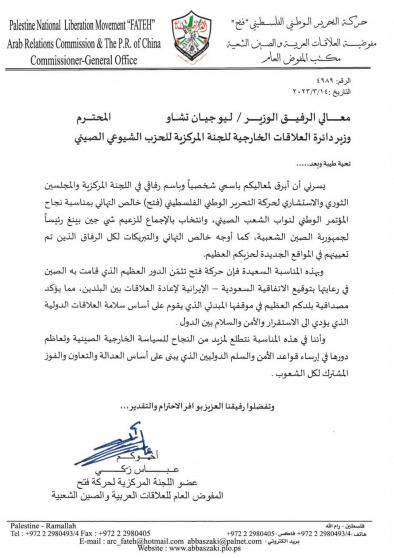 ابرق عباس زكي عضو اللجنة المركزية لحركة فتح المفوض العام للعلاقات العربية والصين الشعبية رسالة تهنئة للحزب الشيوعي الصيني.