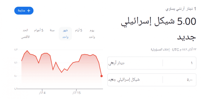 كما تراجع سعر صرف الدينار الأردني مقابل الشيكل مساء اليوم ليصل إلى 5:00 شيكل لكل دينار، بعد أن كان يصرف صباح اليوم بسعر 5:11.
