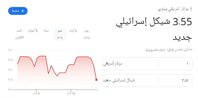سجل الدولار الأمريكي هبوطا حادا أمام الشيكل الإسرائيلي، مساء اليوم الخميس 23 مارس/ آذار 2023 (أول أيام شهر رمضان)؛ وذلك بعد صعود استمر لأسابيع.
