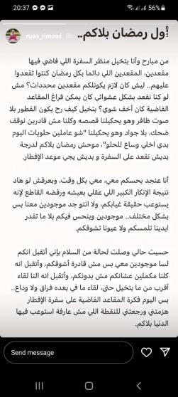 وقالت الريماوي: "من مبارح وانا بتخيل منظر السفرة اللي فاضي فيها مقعدين، المقعدين اللي دائما بكل رمضان كنتوا تقعدوا عليهم.. ليش كان لازم يكونلكم مقعدين محددات؟ مش لو كنا نقعد بشكل عشوائي كان يمكن فراغ المقاعد الفاضية كان أخفف شوي؟".